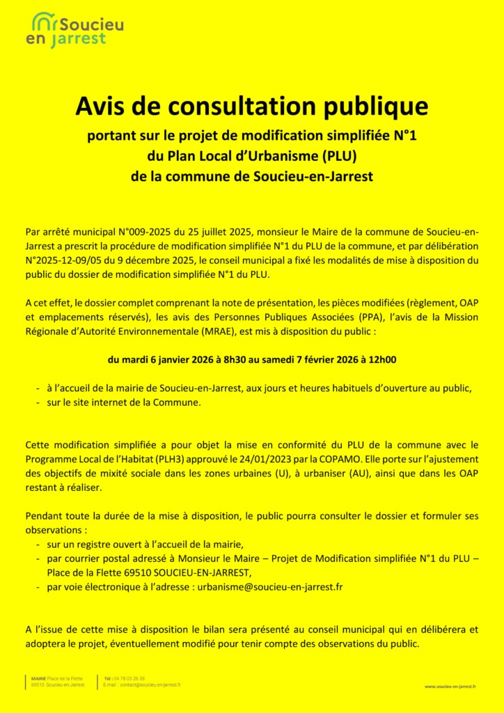 Par arrêté municipal n°009-2025 du 25 juillet 2025, la commune de Soucieu-en-Jarrest a engagé la procédure de modification simplifiée n°1 du Plan Local d’Urbanisme (PLU).