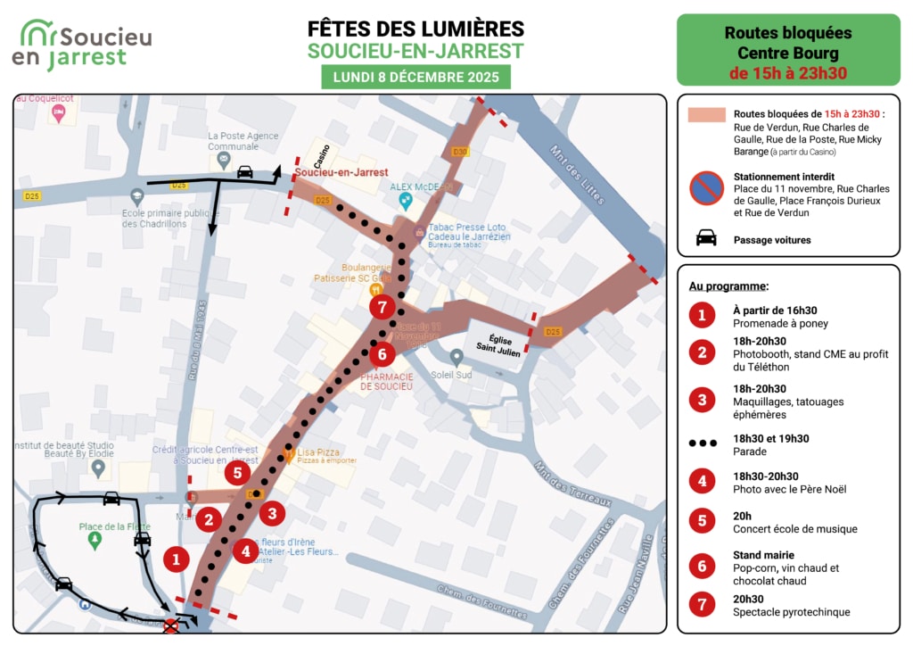Lundi 8 décembre au soir, la rue principale de Soucieu se transformera en véritable lieu de fête, animée par des moments de partage, de convivialité et de magie.