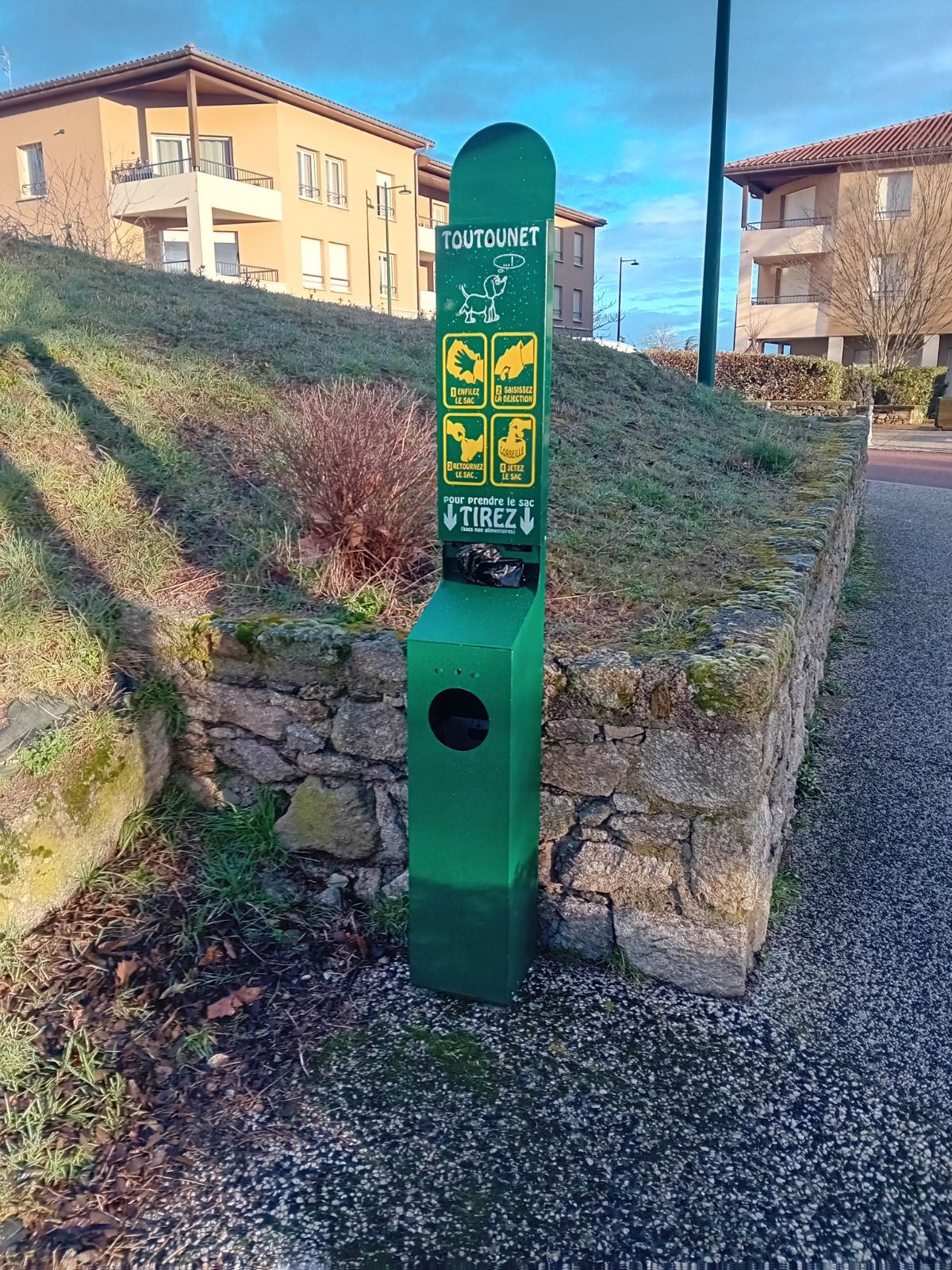 Mise en place des “toutounets” en 3 lieux de la commune : secteur de la Piat, place Etienne Morillon (parking des écoles) et place du planil (Verchery). Il s’agit de distributeurs de sacs de ramassage de déjections canines.
