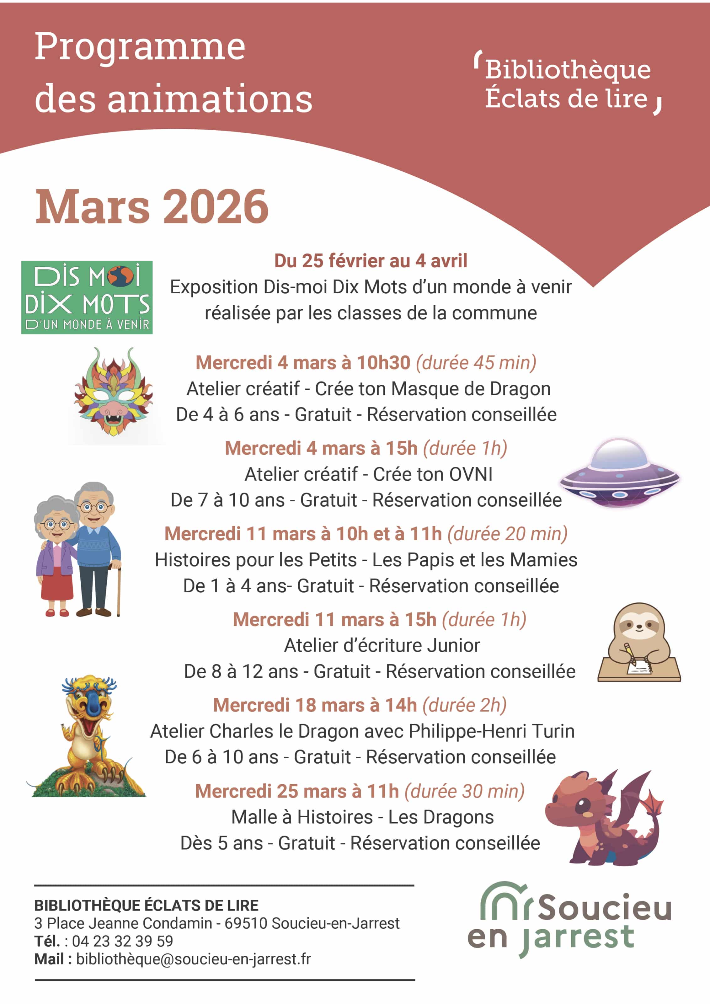 Adresse : Bibliothèque, 3 place Jeanne Condamin – 69510 Soucieu-en-Jarrest